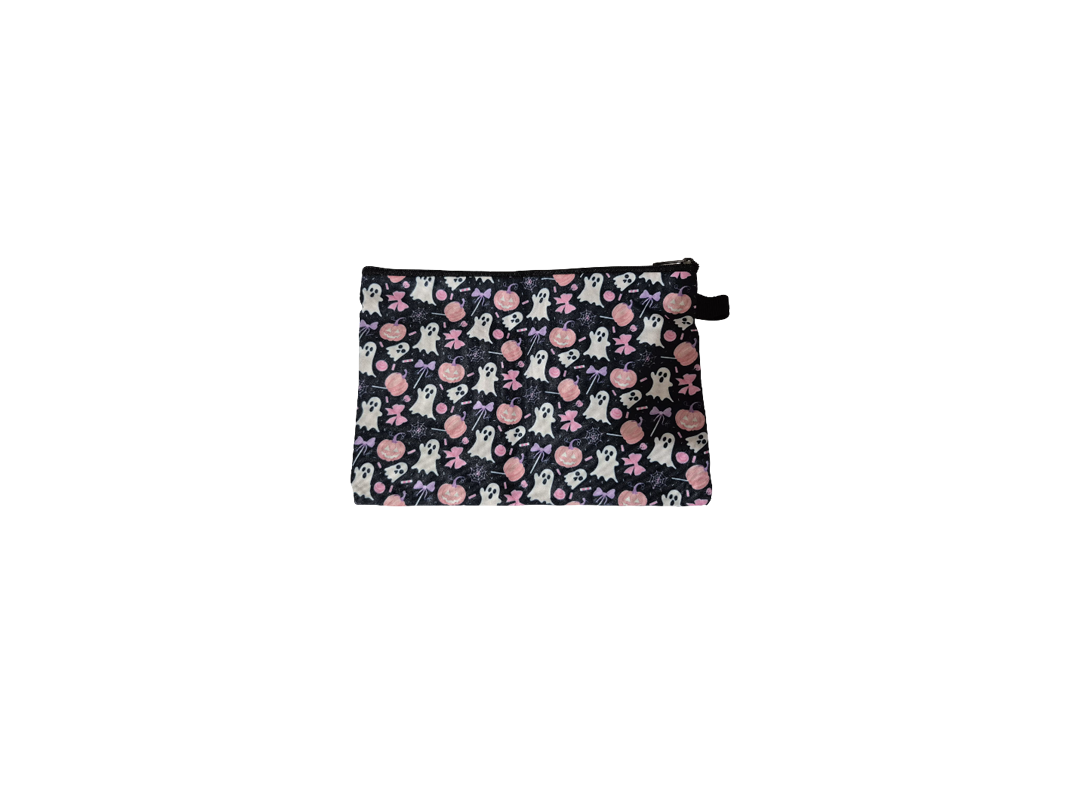 Lleva el espíritu de Halloween contigo con este neceser impermeable de poliéster con forro. Su estampado de fantasmitas, calabazas y lazos en tonos rosa y negro lo convierten en el accesorio perfecto para esta temporada mágica. Práctico y resistente, con cremallera negra, es ideal para guardar maquillaje, accesorios o lo que quieras llevar siempre protegido.